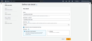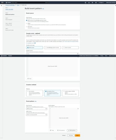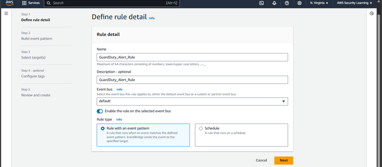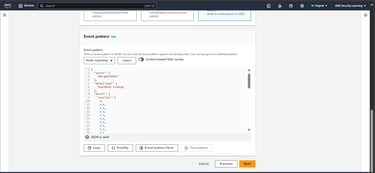 Step 7: Now, let's build the event pattern for GuardDuty findings. This step ensures that the rule triggers only for specific GuardDuty events.