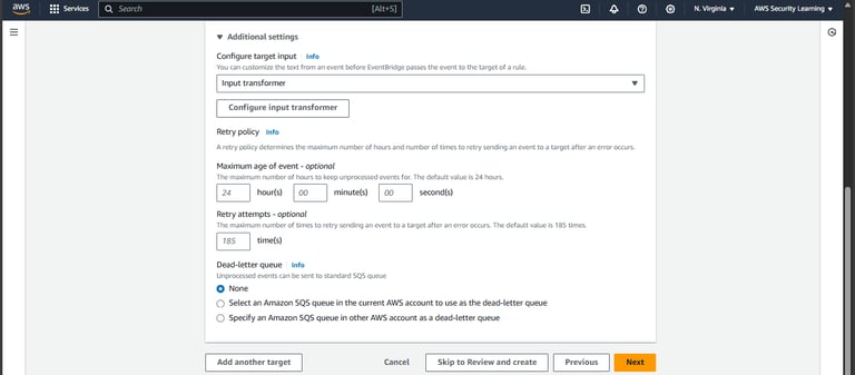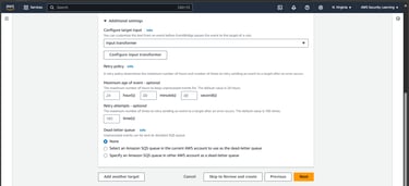 Step 9: Next, click on "Additional settings" and select "Input transformer" under "Configure target input". Then, click on "Configure input transformer". This will allow you to customize the content of the notifications sent by the SNS topic.