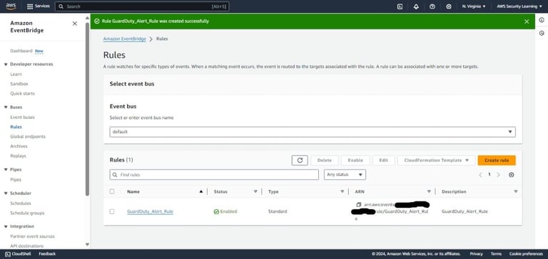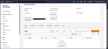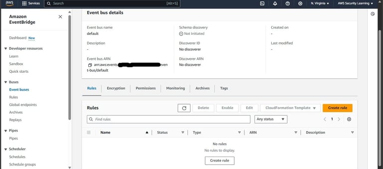 Step 5: Now, navigate to Amazon EventBridge in the AWS Management Console and click on the "default" event bus under the "Event buses" section. Then, click on "Create rule" to set up a rule that will trigger GuardDuty findings to be sent to your security team via SNS email.