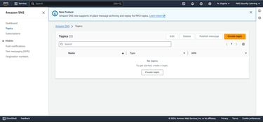 Step 1: To begin, log in to your AWS Management Console using your credentials. Once logged in, navigate to the search bar at the top of the console, type "SNS" into the search tab, and select it from the results. Next, click on the “Create topic” button to start setting up your SNS topic.