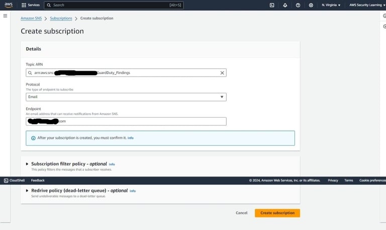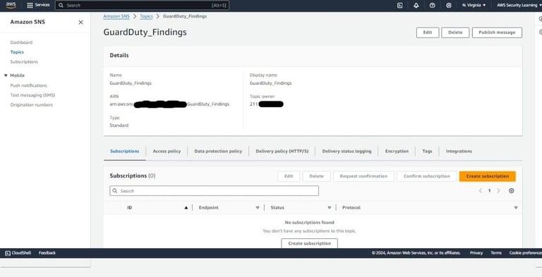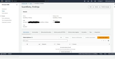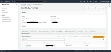Step 3: To receive email alerts for GuardDuty findings, you need to create a subscription for your SNS topic. Click on the topic you just created, then navigate to the "Subscriptions" tab. Click on “Create subscription” and choose “Email” as the protocol. Enter your email address in the "Endpoint" field and click “Create subscription.”
