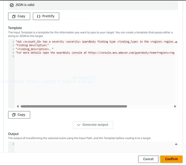Please visit AWS Website Link to copy the JSON for Input Template. This JSON template is used to create a custom message format for notifications sent via SNS. When the input transformer processes the event, it substitutes placeholders with actual values from the event data to generate a readable and informative message.