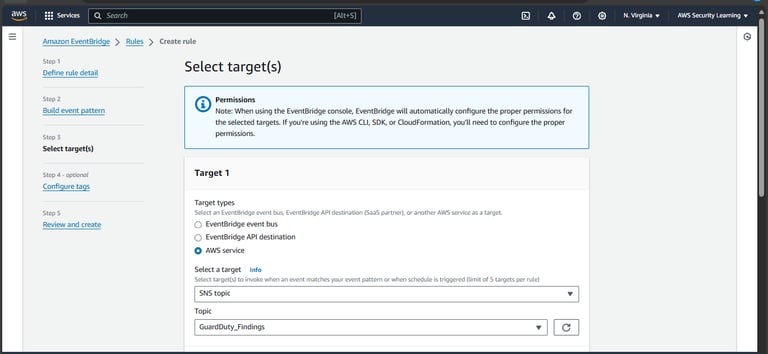 Step 8: Next, choose your configured SNS topic as the target. This will enable email alerts for GuardDuty findings to be sent directly to your specified recipients.
