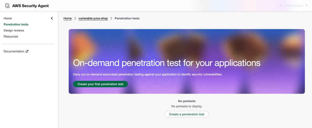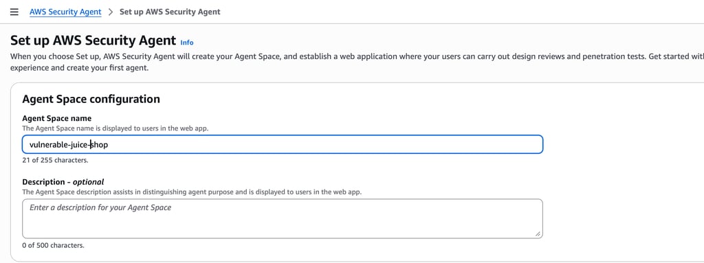AWS Security Agent provides a centralized interface for running automated security assessments, including design reviews, code reviews, and penetration testing. In this blog, we will focus specifically on configuring and running a penetration test against our deployed OWASP Juice Shop application.