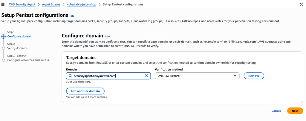 Next, we need to specify the target domain that AWS Security Agent will test.