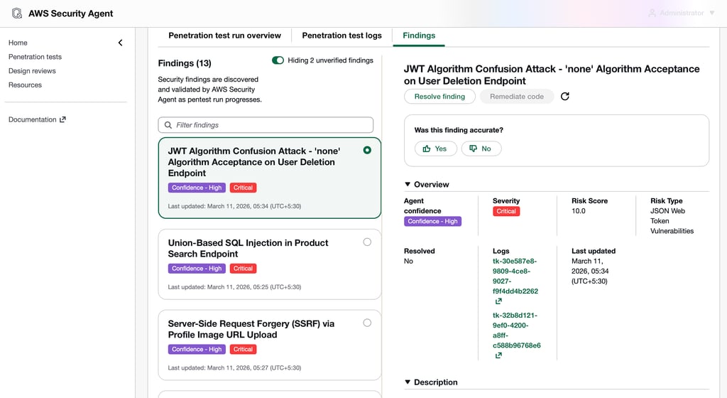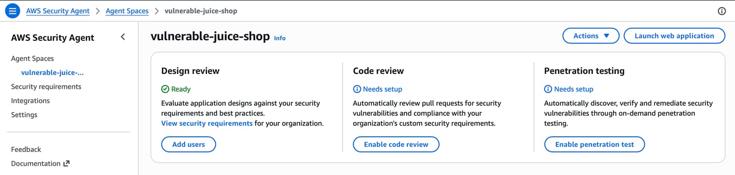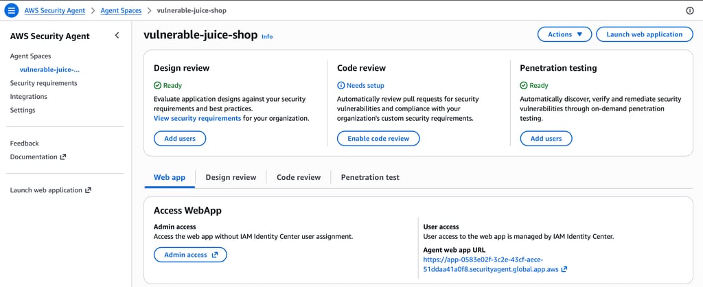 In this walkthrough, we deployed the OWASP Juice Shop vulnerable application and used AWS Security Agent to perform automated penetration testing.