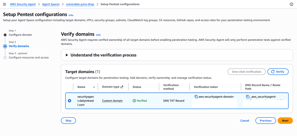 To verify ownership of the domain, AWS Security Agent generates a DNS TXT verification record.