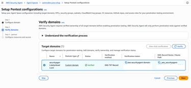 After adding the DNS record, return to the AWS Security Agent console and click Verify.
