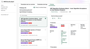 Once the application is deployed and accessible through the ALB DNS endpoint, AWS Security Agent can be configured to run a penetration test against the application and generate security findings.