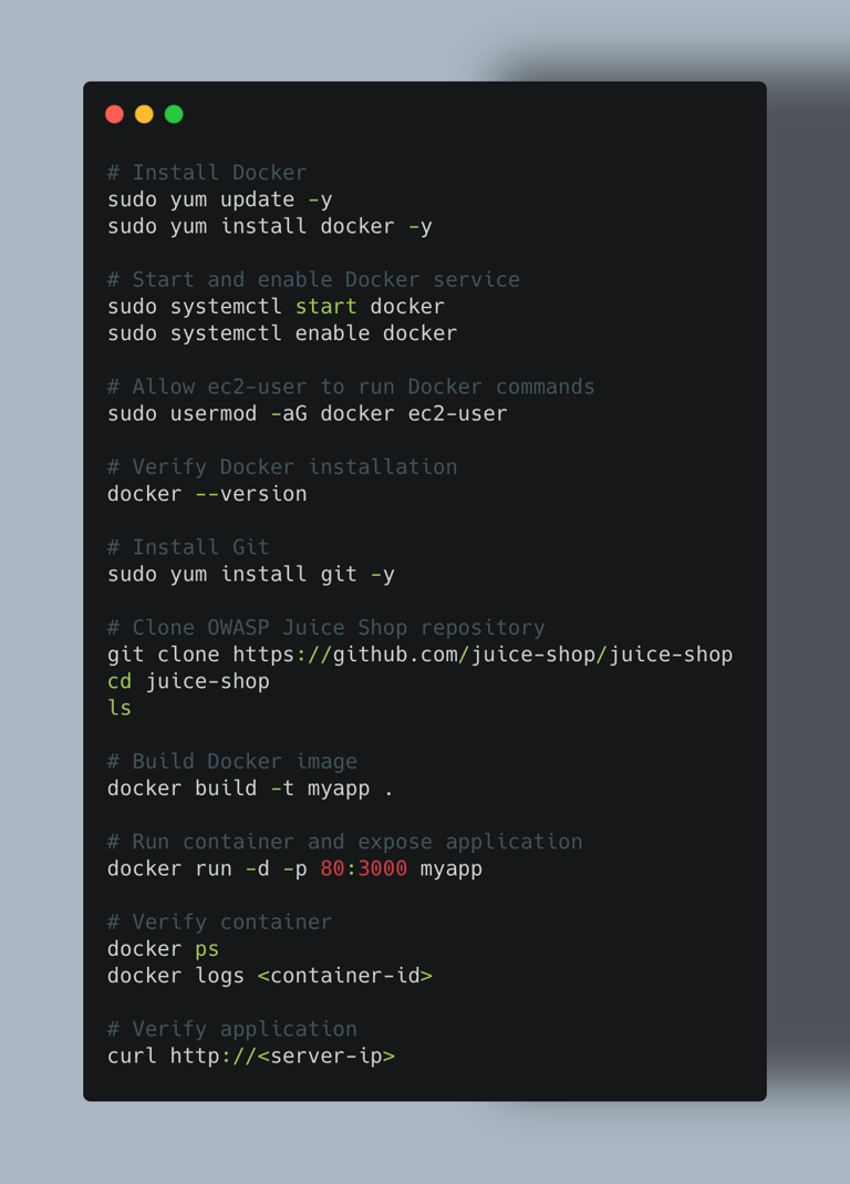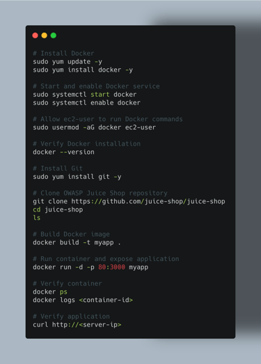 In the next section, we will launch an EC2 instance, install Docker, and deploy the Juice Shop application that will serve as the target for penetration testing.