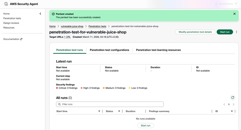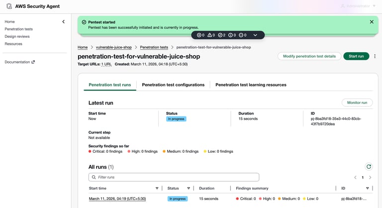 After creating the penetration test, start the test run by clicking Start run. AWS Security Agent will begin executing the penetration test against the configured target URL.