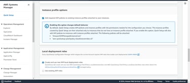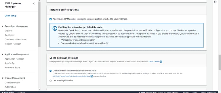 Step 8: Enable the option to add the required IAM policies to the existing instance profiles attached to your instances. By default, Quick Setup creates and attaches the necessary IAM policies and instance profiles only to instances without profiles. However, by enabling this option, the following policies will also be added to instances that already have profiles attached:
