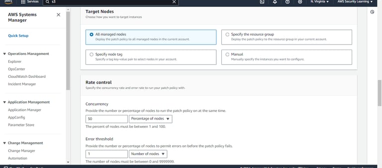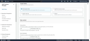 Step 7: Choose the target nodes for patching. You can specify individual instances or apply patching across multiple instances by selecting a resource group or tagging the nodes appropriately. This step defines which systems will be subject to the patch management process.