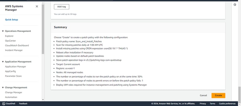 Step 9: After entering all the necessary details for your Patch Manager configuration, review the Summary to verify that everything is set up correctly. Once everything looks good, click on Create to complete the configuration process.
