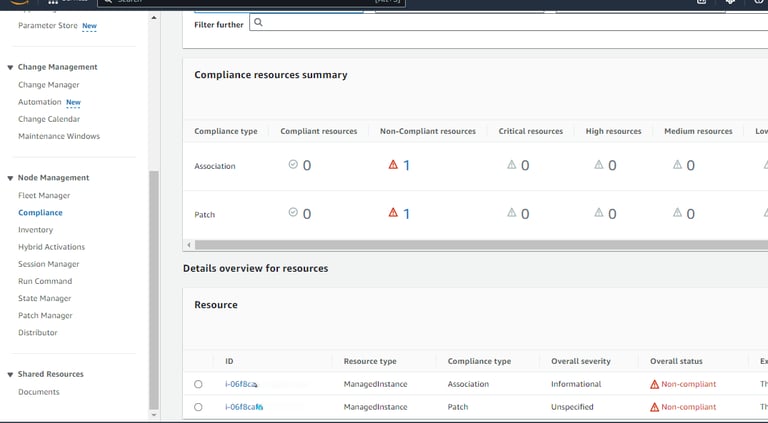 After scanning, you will see details of both non-compliant and compliant resources. Since I have only one instance for testing, it will be listed as non-compliant, with zero compliant resources.